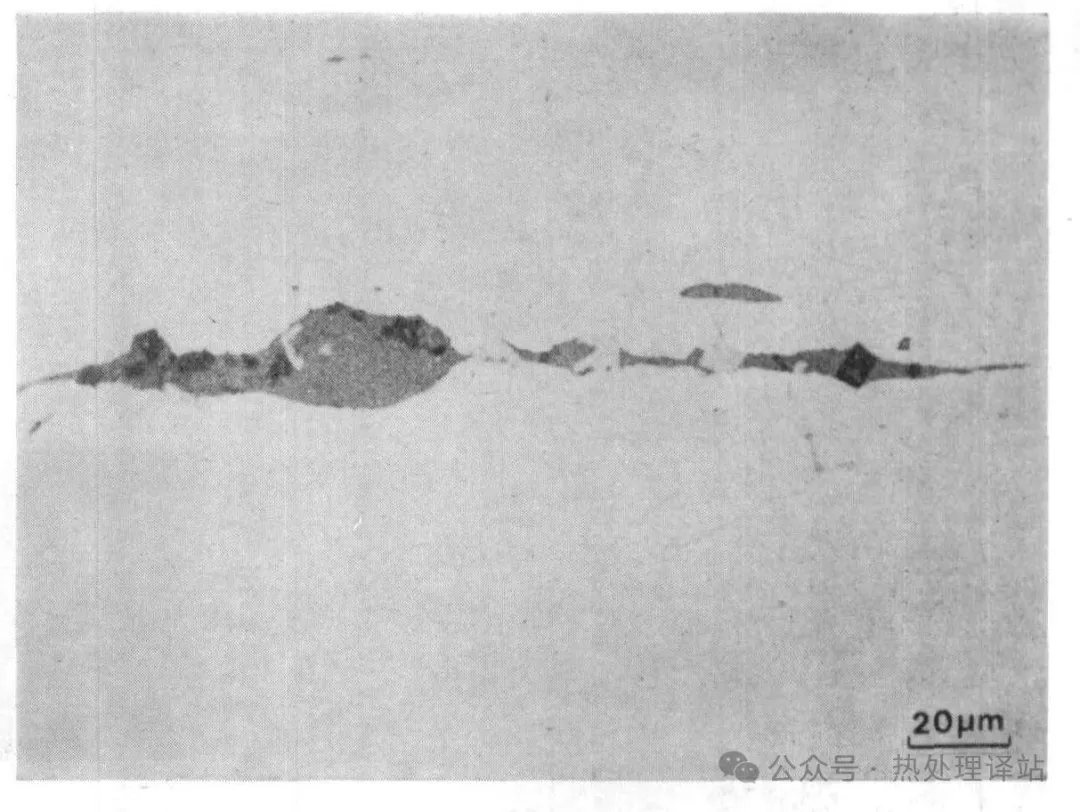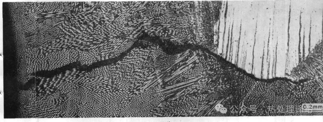 圖17 韓懷月,姜治中,沈棣華,胡銳,不銹鋼焊縫。手工氬弧焊,10%鉻酸電解腐蝕。左端黑色部分為焊縫表面,右上方白色部分為母材(00Cr25Ni20Nb)。X型坡口焊縫裂紋始于根部熔合線,并向焊縫發展。