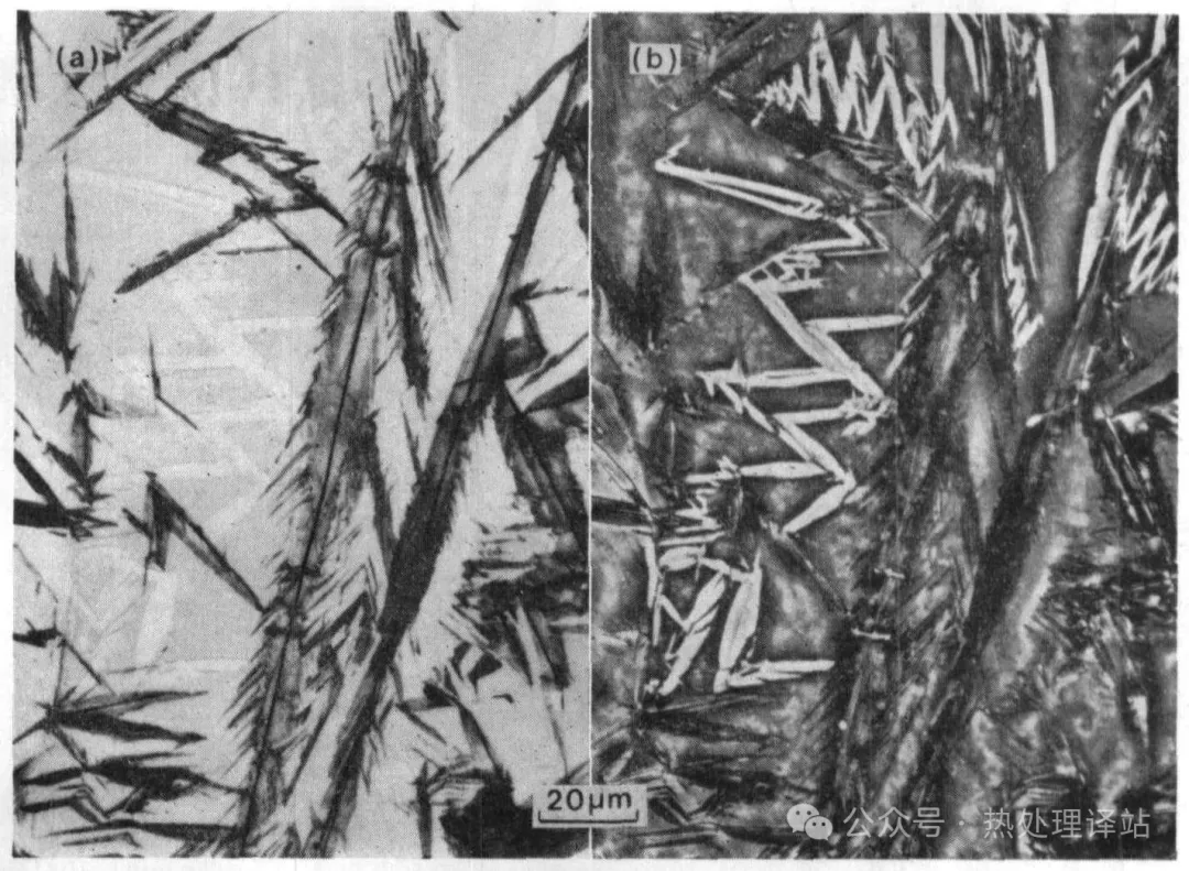 圖20 上海交通大學金相實驗室,18CrNiW鋼,960℃滲碳24h,水淬,-70℃冰冷處理,4%硝酸酒精溶液腐蝕。(a)明場,淬火時先形成的粗大馬氏體及冰冷處理時新形成的馬氏體(白色)。(b)相襯照明,與a同一視場,奧氏體基體上新形成的白色馬氏體清晰可辨。
