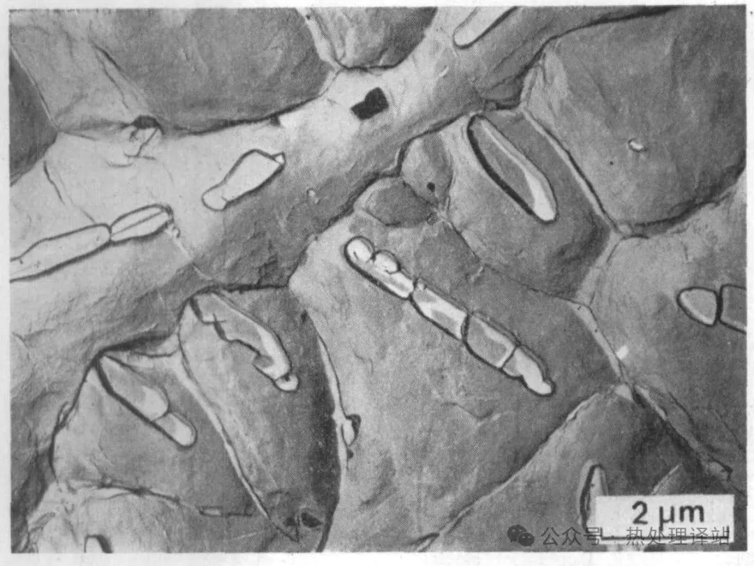 圖22 林治明,22Mn2MoCuBRE鋼,鑄造后調質處理,沖擊斷口,透射電鏡(復型)照片。長條狀氮化鋁沿柱狀晶晶界析出,在沖擊載荷下造成沿晶斷裂。