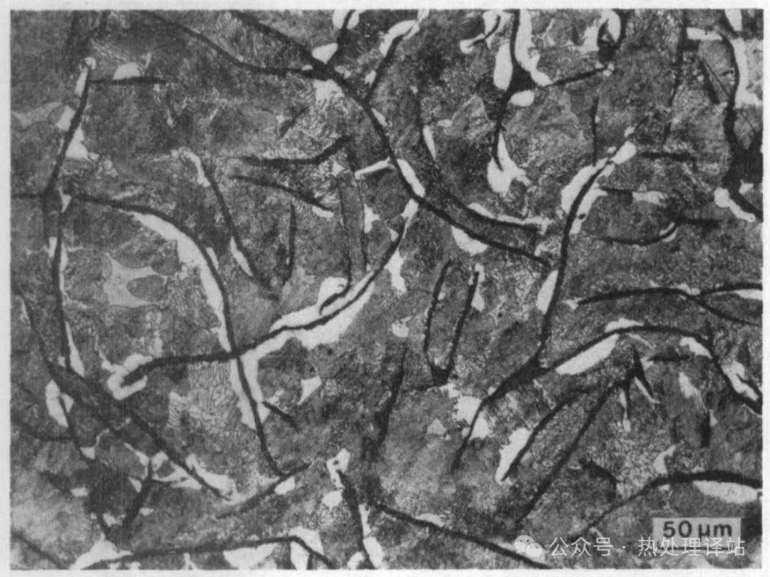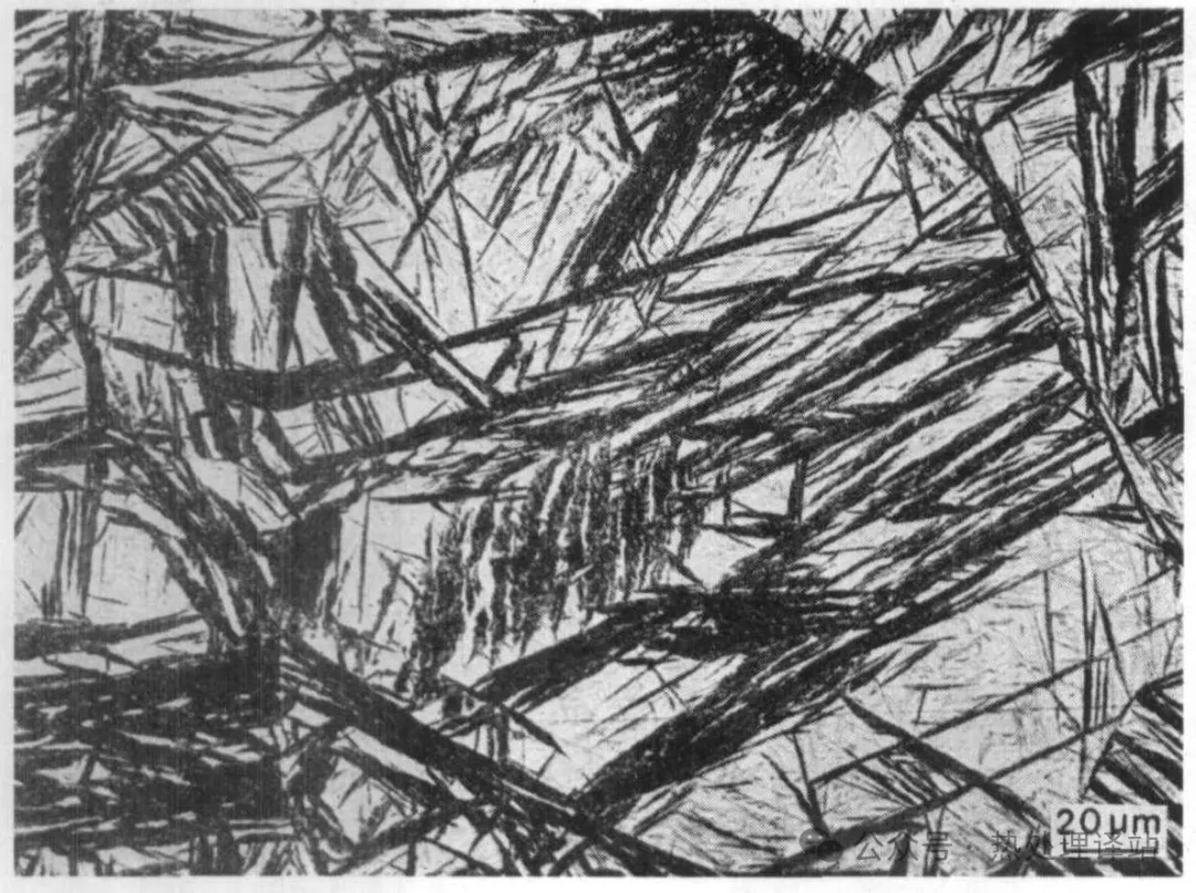 圖12 湯濂,丁寶文,劉國杰,30CrMnMoRE鋼,1000℃加熱罐中空冷。腐蝕劑:硝酸酒精溶液。下貝氏體(針狀)及少量上貝氏體(羽毛狀)。