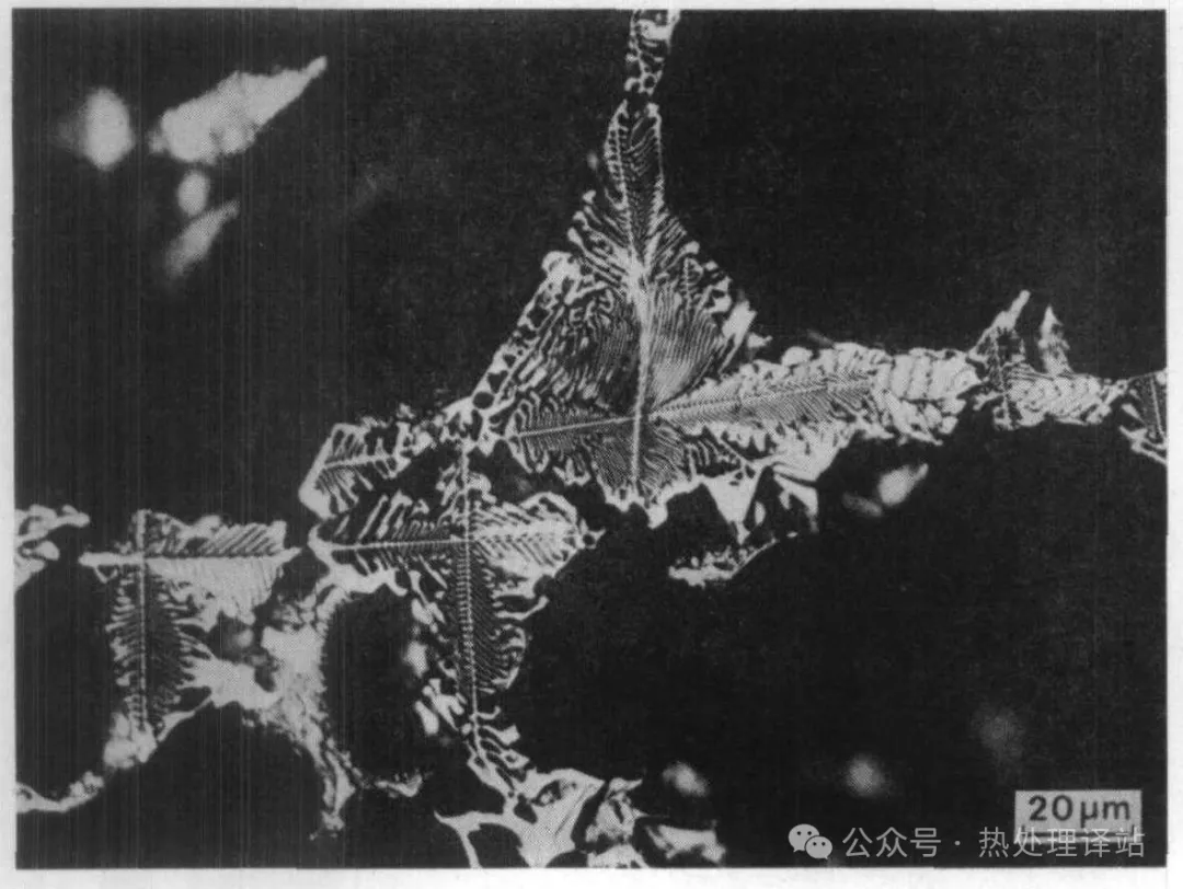 圖15 吳可秋,W18Cr4V高速鋼(鑄態),重鉻酸鉀飽和溶液加硫酸,室 溫擦蝕1h。 試劑將鋼的基體溶去,在斜射照明下,魚骨狀萊氏體共晶中碳化物骨架更富有立體感。