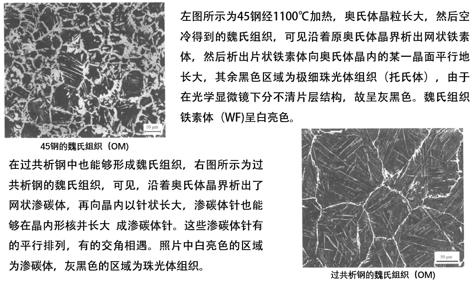 魏氏組織實際上是一種 偽共析轉變組織。亞共析鋼的魏氏組織是先共析鐵素體在奧氏體晶界形核,呈方向性片狀長大,即沿著母相奧氏體的{111}γ,晶面(慣習面)析出,一般為過熱組織,是過熱的奧氏體組織在中溫區的上部區轉變為向晶內生長的條片狀的鐵素體和極細的片狀珠光體(托氏體)的整合組織。