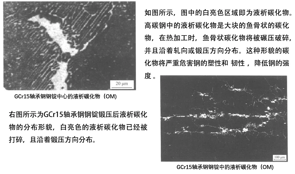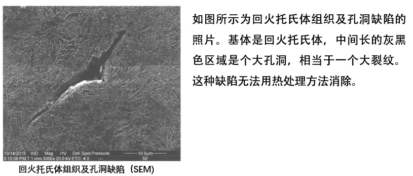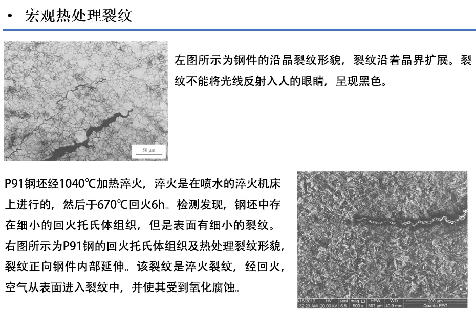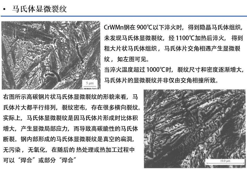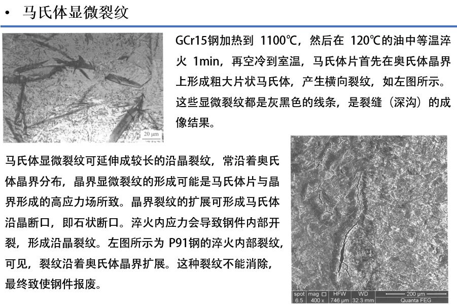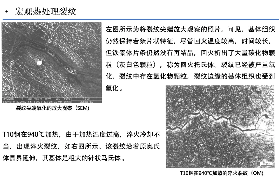 馬氏體顯微裂紋 當高碳馬氏體片交角相遇時,由于相變瞬時體積膨脹,造成局部巨大的內應力(第二類內應力),會產生撞擊裂紋。 宏觀熱處理裂紋 鋼坯、零件等經熱加工可能產生宏觀淬火裂紋,是第一類內應力作用的結果 ,宏觀裂紋導致產品報廢。最常見的是熱處理裂紋, 例如淬火裂紋。淬火裂紋可以是穿晶裂紋,也可以是沿晶裂紋。穿晶裂紋可形成解理斷口或準解理斷口;而沿晶裂紋則形成石狀斷口或冰糖塊斷口。 網狀碳化物一般是沿著原奧氏體晶界呈網狀分布的碳化物,能夠降低鋼的機械性能,并且易于導致淬火裂紋。網狀碳化物較容易識別。 液析碳化物是鋼錠凝固時由于選擇性結晶而使鋼錠中心部位結晶剩余的鋼水中碳含量增高,合金元素含量也增高,鋼水中的碳和合金元素富集到了亞穩 萊氏體共晶成分,從這部分鋼水中析出了碳化物,稱為液析碳化物(一次碳化物)。 液析碳化物有兩個特征: (1)在光學顯微鏡下,液析碳化物呈白亮色(灰度近于0%); (2)魚骨狀碳化物被破碎后仍然是較大塊的,比馬氏體回火析出的碳化物大得多,形狀也不規則。 液析碳化物的硬度很高,脆性大,能夠降低鋼的韌性,必須予以消除。在冶金廠,鋼錠或鋼坯中的液析碳化物主要通過擴散退火來消除。軸承鋼中的液析碳化物開始熔化的溫度為1130℃,所以一般在1250℃以上加熱,長時間保溫進行均質化退火,即擴散退火。