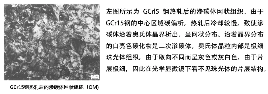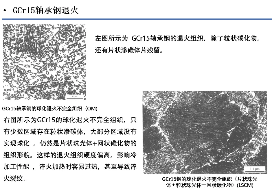 工具鋼球化退火可為加工和淬火作好組織準備。軸承鋼球化退火應當得到均勻細小的粒狀珠光體組織,為淬火作組織準備。但是當退火工藝不當,則會出現不完全球化,殘留并存在部分片狀珠光體。