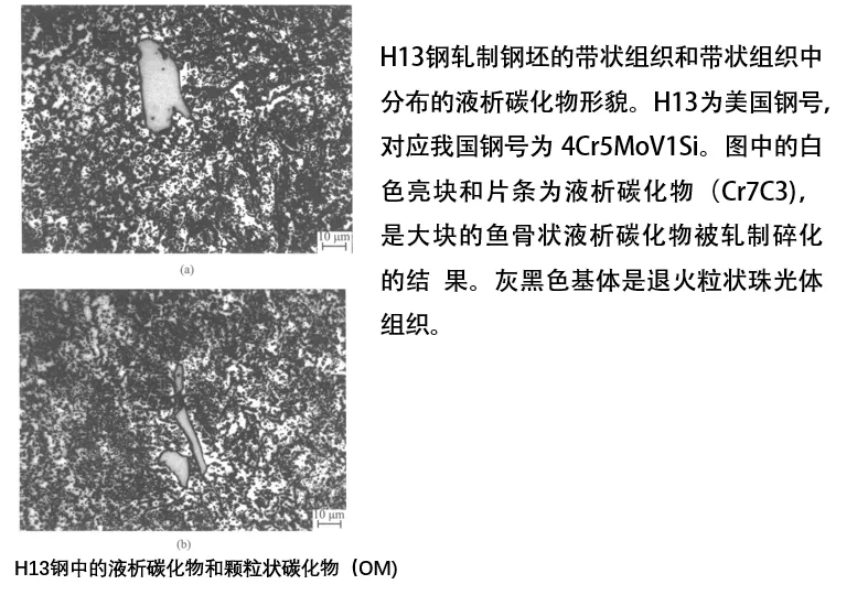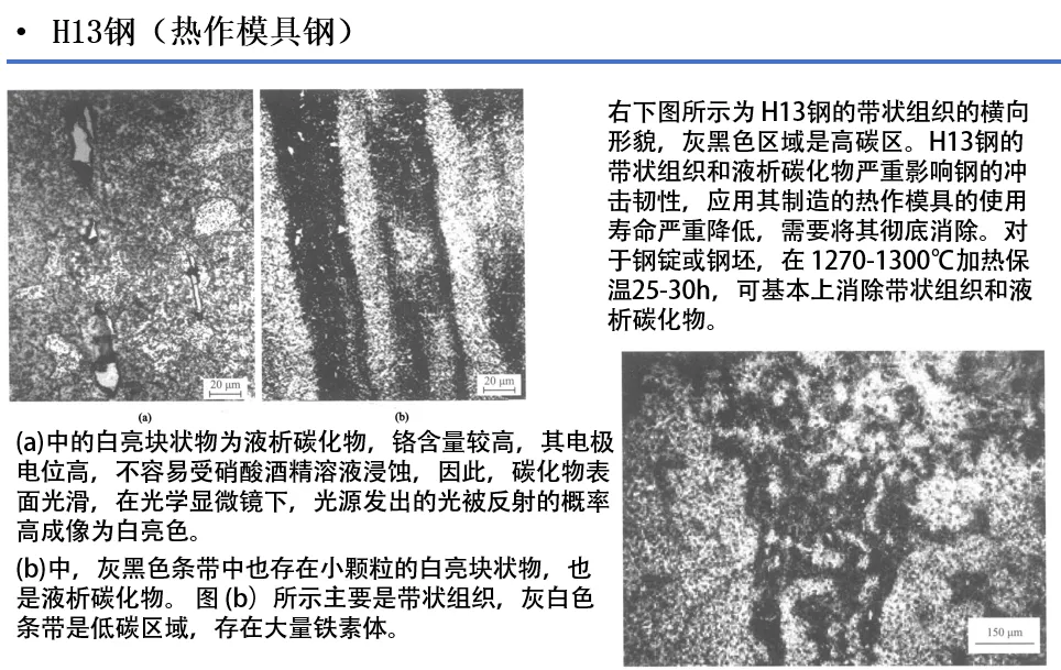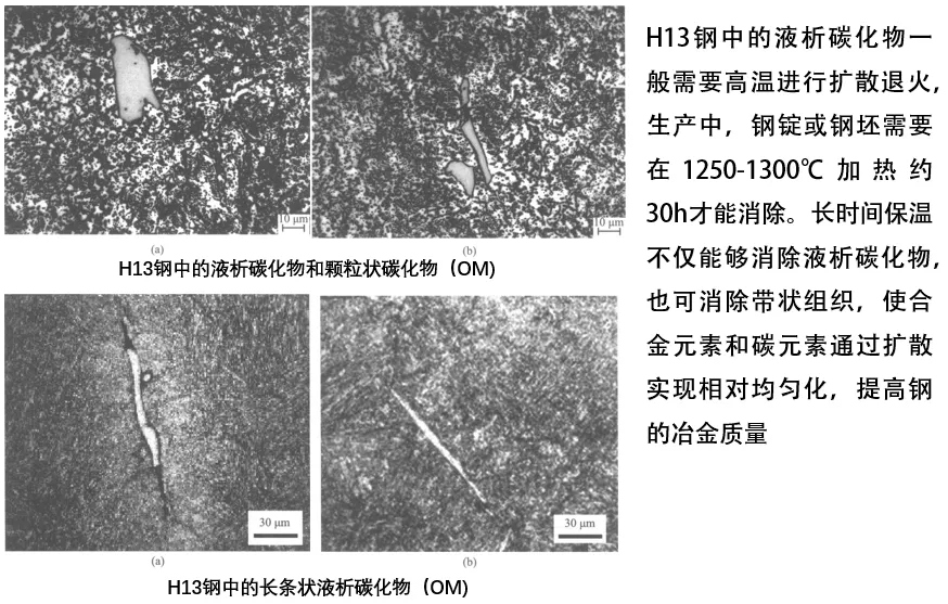 H13鋼中的液析碳化物一般需要高溫進行擴散退火。生產中,鋼錠或鋼坯需要在1250-1300℃加熱約30h才能消除。長時間保溫不僅能夠消除液析碳化物,也可消除帶狀組織,使合金元素和碳元素通過擴散實現相對均勻化,大大提高鋼的冶金質量。