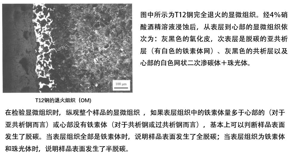 通常,在高溫下(一般指700℃以上),鋼中的碳原子比鐵原子更容易氧化,同時,脫碳需要碳原子在鋼中的擴散。在低溫下,碳原子擴散慢。因此,脫碳一般發生在高溫狀態,低溫下加熱一般不存在明顯脫碳。通常所說的脫碳都是指鋼在奧氏體溫度范圍內發生的。一般地,在回火溫度范圍內發生氧化,不發生脫碳。脫碳層深度可根據國標 GB/T224-1987《鋼的脫碳層深度測定法》進行測定。