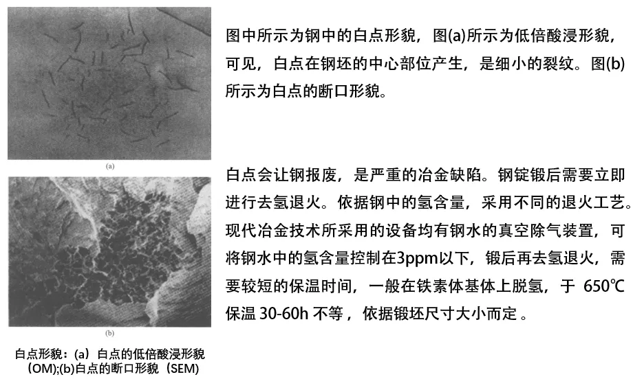 當合金結構鋼、合金工具鋼、合金模具鋼等鋼錠、鋼坯的氫含量較高時,需要進行去氫退火,將氫含量降低到1.8ppm(1ppm=10-7)以下,以免產生白 點缺陷。白點是鋼中的微小裂紋,或稱為發裂。