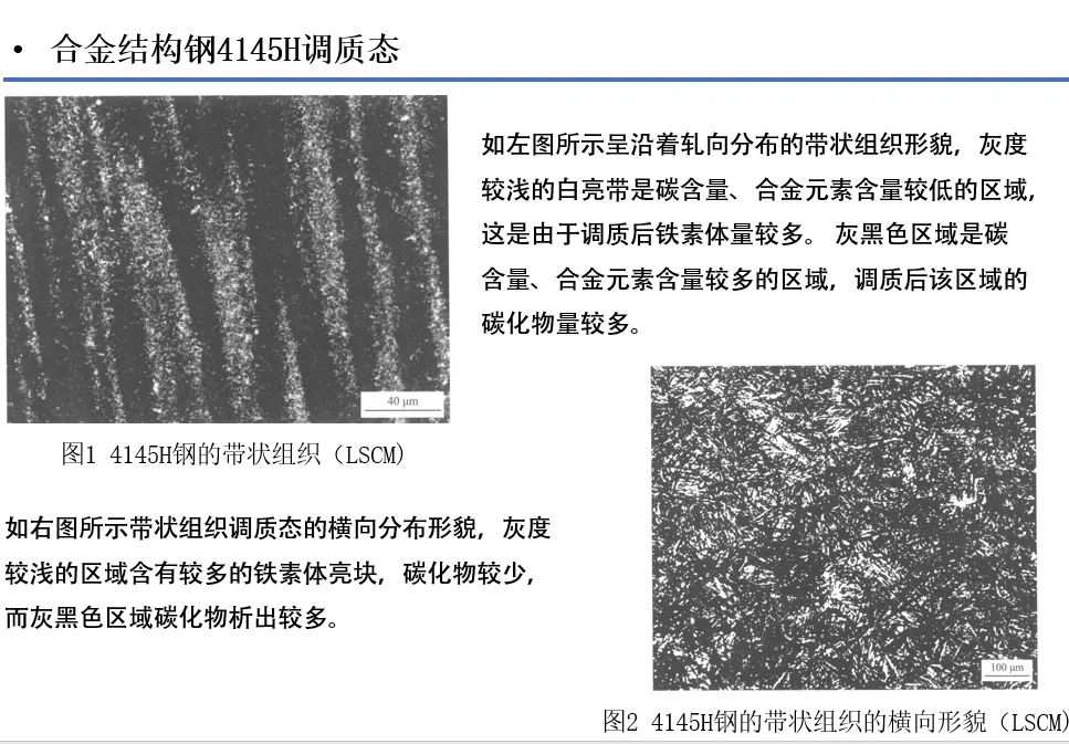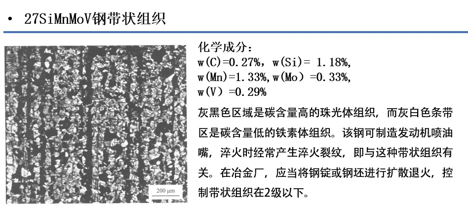帶狀組織是鋼中常見的冶金缺陷,帶狀組織影響鋼的強韌性,尤其是降低縱向沖擊韌性。熱處理時易產生淬火裂紋。合金鋼中的帶狀組織難以消除,一般需在1250℃以上加熱30h才能消除。