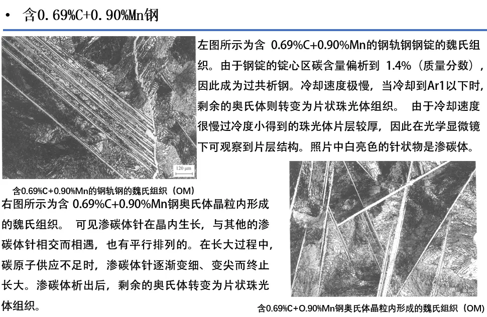 魏氏組織實際上是先共析和共析分解產物。對于亞共析鋼,其魏氏組織是先共析鐵素體+珠光體的整合組織,先共析鐵素體從奧氏體中負脫溶,形 成網狀鐵素體和針狀鐵素體,冷卻到Ar1以下時進行共析分解,轉變為片狀珠光體組織;對于過共析鋼,先共析滲碳體(二次滲碳體)正脫溶,析出滲碳體網和滲碳體針,冷卻到 Ar1以下時發生共析分解,轉變為片狀珠光體組織。