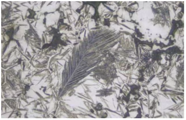 過共晶白口鑄鐵結晶過程的基本反應為:勻晶反應+共晶反應+二次析出反應+共析反應。