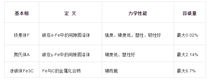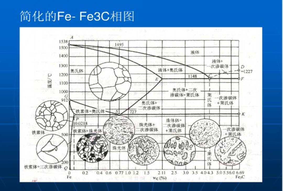01 金相分析(Metallographic Analysis)是材料科學與工程領域中的一種重要研究方法,主要用于研究和表征金屬及其合金的微觀結構。通過金相分析,可以獲取材料內部的晶粒形態、相分布、夾雜物、孔隙、析出物、變形特征以及其他微觀結構特征的信息。這些微觀結構直接影響材料的機械性能、物理性能以及化學性能,因此金相分析在材料設計、質量控制、失效分析等方面具有重要作用。金相分析在生產實際中常常稱為金相檢驗,在材料研發、生產過程控制、故障診斷和質量保證中都是不可或缺的工具。 首先要明確金屬和合金在固態下,通常都是晶體。 晶體就是原子在三維空間中有規則作周期重復排列的物質,就是說,在金屬和合金中,原子的排列都是有規則的,而不是雜亂無章的。 晶體通常具有如下的特征: 1.均勻性; 2.各向異性; 3.能自發地組成多面體外形; 4.具有確定的熔點; 5.晶體的理想外形和內部結構都具有特定的對稱性; 6.對X射線產生衍射效應。 金相檢驗的基礎包括樣品制備、腐蝕處理、顯微觀察和圖像分析。樣品制備涉及切割、鑲嵌、研磨和拋光,以獲得平滑的表面。腐蝕處理使用特定的化學試劑揭示材料的微觀結構。顯微觀察通過光學顯微鏡、掃描電子顯微鏡(SEM)或透射電子顯微鏡(TEM)獲取樣品圖像。圖像分析則通過軟件對顯微圖像進行定量和定性分析,以評估材料的微觀結構和性能。 立方晶格(Cubic):立方晶格是最對稱的晶格結構,其單位晶胞的三個邊長相等,且每個角度都是90度。常見的立方晶格類型包括簡單立方晶格(SC)、體心立方晶格(BCC)和面心立方晶格(FCC)。體心立方晶格中的原子不僅位于立方體的角落,還位于中心,而面心立方晶格在角落和每個面中心都布滿了原子,這使得FCC晶格的密度通常較高。 四方晶格(Tetragonal):四方晶格的單位晶胞具有一個邊長與另兩個邊長相等,且角度都是90度。四方晶格包括簡單四方晶格和體心四方晶格。簡單四方晶格的原子排列較為簡單,而體心四方晶格則在簡單四方晶格的基礎上,在中心位置添加了一個額外的原子,使結構更復雜。 正交晶格(Orthorhombic):正交晶格的單位晶胞三個軸都互相垂直,但邊長不相等。常見的正交晶格類型包括簡單正交晶格、體心正交晶格(BCO)和面心正交晶格(FCO)。體心正交晶格在簡單正交晶格的基礎上添加了一個中心原子,而面心正交晶格則在每個面中心有額外的原子,形成更復雜的結構。 單斜晶格(Monoclinic):單斜晶格的單位晶胞具有兩個軸互相垂直,第三個軸與這兩個軸不垂直的特征。該晶格類型包括簡單單斜晶格和體心單斜晶格。體心單斜晶格在簡單單斜晶格中添加了一個中心原子,使得結構更加復雜。 三斜晶格(Triclinic):三斜晶格是最復雜的晶格類型,其單位晶胞的三個軸長度和相互夾角都不相等。沒有任何軸與其他軸垂直,導致其晶胞形狀較為不規則。三斜晶格的結構具有最低的對稱性,因此在自然界中相對少見。 六方晶格(Hexagonal):六方晶格的單位晶胞具有兩個邊長相等,且底面為正六邊形的結構。其軸長不同于底面軸,角度為120度和90度。簡單六方晶格中的原子排列在一個六邊形的底面上,結構具有較高的對稱性。 羅頓晶格(Rhombohedral):羅頓晶格的單位晶胞中的三個軸長度相等,但軸間夾角不為90度,通常是60度或120度。雖然在幾何上看起來像一個“斜方立方體”,但所有邊長相等的特點使其成為一種對稱的晶格結構。 相圖中特性點符號及含義 相圖主要特性線 相圖的相區 1.單相區,簡化的Fe-Fe3C相圖中有F、A、L和Fe3C四個單相區。 2.兩相區,簡化的Fe-Fe3C相圖中有L+A、L+Fe3C、A+F、A+FeC和F+Fe3C五個兩相區。 每個兩相區都與相應的兩個單相區有相鄰兩條三相共存線,即: 共晶線:ECF、L、A和Fe3C三相共存。 共析線:PSK、A、F和Fe3C三相共存。 鐵碳合金的基本相 AC1 –加熱時,珠光體向奧氏體轉變的開始溫度。 Ar1 –冷卻時,奧氏體向珠光體轉變的開始溫度。 AC3 –加熱時,先共析鐵素體全部轉變為奧氏體的終止溫度。 Ar3 –冷卻時,奧氏體開始析出先共析鐵素體的溫度。 Accm–加熱時,二次滲碳體全部融入奧氏體的終止溫度。 Arcm–冷卻時,奧氏體開始析出二次滲碳體的溫度。 通常把加熱時的臨界溫度加注下標“C”,冷卻時的臨界溫度加注下標為“r” 鐵碳合金的七種類型 1.工業純鐵:w(C)﹤0.0218% 2.共析鋼:w(C)=0.77% 3.亞共析鋼:w(C)=0.021%~0.77% 4.過共析鋼:w(C)=0.77%~2.11% 5.共晶白口鐵:w(C)=4.30% 6.亞共晶白口鐵:w(C)=2.11%~4.30% 7.過共晶白口鐵:w(C)=4.30%~6.69% 鐵素體: 碳溶于ɑ-Fe中的間隙式固溶體稱為鐵素體,常用F表示。因為體心立方晶格的ɑ-Fe總的間隙量雖大,但是間隙半徑卻很小,所以碳在ɑ-Fe中的溶解度極小,室溫下不超過0.005%,隨著溫度升高,溶解度略有增加,在727度時達到最大值,也僅有0.0218%。 鐵素體含碳量很低,其性能接近純鐵,是一種塑性、韌性高和強度、硬度低的組織。 奧氏體: 碳溶于γ-Fe中的間隙式固溶體稱為奧氏體,常用A表示。因為面心立方晶格的γ-Fe總的間隙量雖比ɑ-Fe的小,但空隙半徑比較大,所以能溶解較多的碳。碳在γ-Fe中的溶解度隨溫度升高而增加,在727度時為0.77%,在1148度時達到最大值2.11%。 奧氏體塑性很好,強度和硬度也比鐵素體高。 滲碳體: 滲碳體是鐵與碳的化合物,常用Fe3C表示。 滲碳體的含碳量為6.69%,熔點約為1227度,晶體結構復雜,硬度很高,脆性極大,幾乎沒有塑性