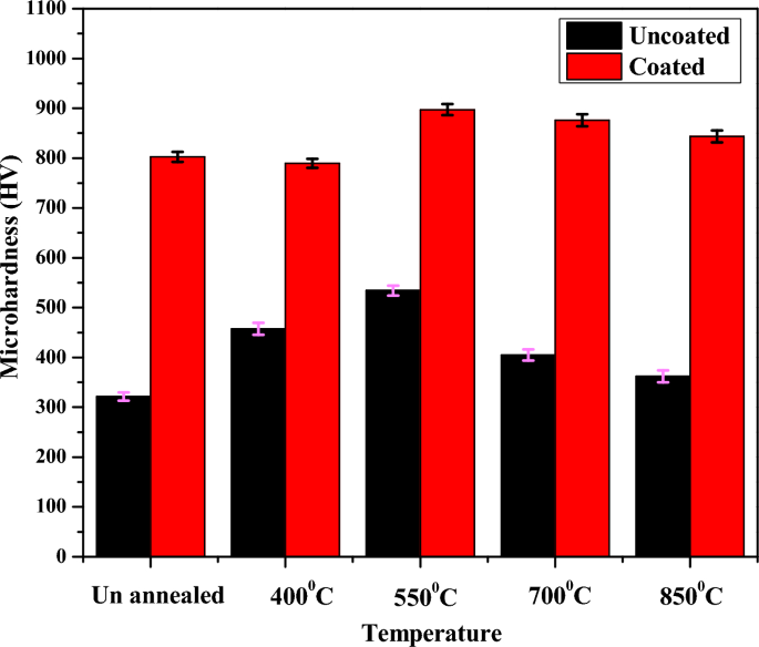 未涂層樣品和經APS涂層樣品的維式顯微硬度如圖8所示。涂層樣品的平均顯微硬度為794 HV。在較低溫度(400℃、550℃)下退火的樣品的硬度會有所提升,而在較高溫度(700℃、850℃)下退火,材料的硬度卻有所降低。這表明在低溫退火下APS涂層樣品具有出色的軟化抗性。在550℃條件下退火有涂層的樣品比未涂層的樣品顯微硬度提高了46%。而在高溫條件下退火樣品顯微硬度出現降低是由于鋼基底上存在的σ相會引起材料軟化。 通常認為樣品及涂層中的BCC相有助于阻礙位錯的發生,從而會提高硬度。然而在高溫退火下,在涂層中本身處于次要的FCC相出現擴張,從而導致顯微硬度的降低34,35。通過XRD分析經550℃退火的樣品BCC相的占比來證明這一點36。且在高溫下的顯微硬度降低還要歸因于晶粒的生長和晶粒的粗化。這會導致晶粒的生長和相移,從而使材料的顯微硬度降低37,38。因此,下面的測試會使用顯微硬度最高的在550℃下退火的材料進行。