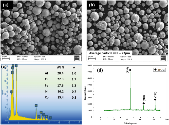 對氣霧化制備的AlCoCrFeNi HEA粉末進行了微觀結構分析。其SEM形態如圖2a和2b所示。粉末形態為緊密堆積的球形顆粒,均勻且均質。同時,觀察到較大球形顆粒上的微小準球形形成,但這些均沒有偏離預期的結果,進一步驗證了先前的發現28。通過HEA粉末的SEM圖像可以得出形成球形顆粒是氣霧化制備HEA粉末的基本原理29,30。HEA粉末顆粒的平均粒徑在20–25微米之間。 通過圖2c所示的EDS映射確認了形成HEA的各個元素及其比例關系,且證明了制備的HEA粉末中的雜質含量明顯降低,這也可能是其具有更優秀性能的原因之一。通過對包括密勒指數在內的測試,證明了HEA粉末的相結構轉變為為BCC相。并XRD驗證了單相固溶體的形成(圖2d)。 圖二:(a) 掃描電鏡圖像 (b) 粒度標記 (c) 能譜元素像分析 (d) AlCoCrFeNi 高熵金屬的X射線衍射譜圖