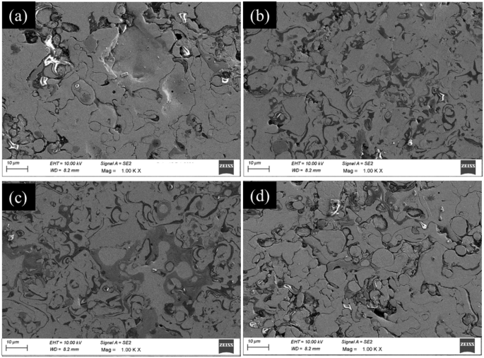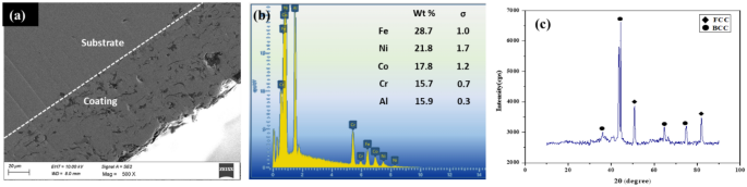 對使用AlCoCrFeNi HEA為原料通過APS方法噴涂的涂層樣品的微觀結構表征如圖3所示。通過SEM在不同放大倍率下對未噴涂的樣品表面和涂層表面的飛濺形貌進行了詳細的研究。通過觀察可得正是由于HEA為均勻的單相固溶體,使其可以均勻的分布在樣品表面。這樣的均質結構顯著增強了HEA涂層與基材之間的結合作用。這分子間的作用力得到增強從而提高了涂層的強度及附著力。且界面間的作用力的能夠顯著增強材料的各項機械性能,從而使材料應用更加廣泛。圖3a的涂層表面的SEM圖展示了涂層為具有少量孔隙的層狀結構。與晶體取向、晶粒邊界或其他結構特征相比,層狀結構是涂層微觀結構的主要結構單元。從整體上看還顯示出由于涂層過程中高熱能引起的深色和淺色噴濺斑點。這些噴濺斑點是熔融的液滴在快速升溫后凝固和分散造成的。圖3b所示的涂層表面的EDS映射進一步證實了HEA粉末能夠成為一種涂層材料。從圖3c展示的涂層表面的XRD圖中能夠得出其晶體結構轉變為以BCC為主要晶型以及FCC相為次要晶型。
