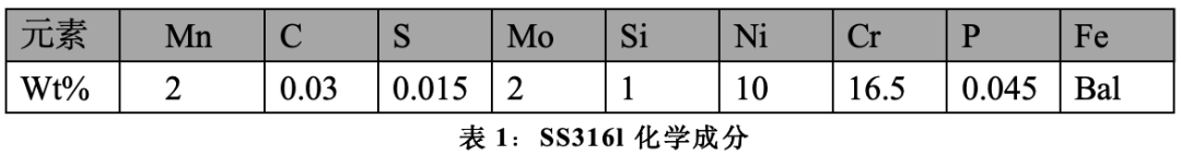 在本研究中,選擇了金屬元素Al、Co、Cr、Fe和Ni作為高熵合金(HEA)的組成元素。Ni和Co能夠提高塑性,Al、Fe和Co提供機械性能的改善,而Al、Co和Cr增強了耐腐蝕和抗氧化性能。所選元素的純度為99%,且按等原子比進行配置。HEA通過真空下的氣體霧化工藝形成。而霧化工藝能夠生成球形粉末顆粒正是該合成方法可以合成HEA的原因23,24。SS316L級鋼材由于上述應用中會隨著時間推移而發生嚴重腐蝕,因此需要控制其腐蝕效應。因此,選擇SS316L作為基材,并進行了實驗以優化和研究其特性。SS316L鋼的化學成分如表1所示。