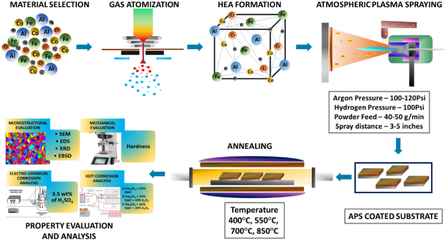 工業應用中偶然的需求推動了對先進材料的探索,并且持續研究以開發解決工業性能相關問題的新型材料和加工技術是至關重要的。自合金的出現以來,一直是通過將兩種或多種元素結合在一起改善基材的性能1。 目前材料科學研究的趨勢表明,合金化能提供比基材更優越的特性。材料科學應用廣泛,這些為滿足需求的探索促成了高熵合金(HEA)的發展。盡管HEA具有復雜的性質,但它也提供了更好的性能。HEA是由五種或更多元素按照等原子或近等原子比例混合而成。盡管HEA形成合金的系統復雜且存在生成金屬間化合物的高可能性,但由于其高混合熵,HEA的體系仍表現出單相固溶體的特性2,3。 通過對HEA成分的定制化以最佳地滿足需求是高熵合金涂層的優勢4,5。Chiu等通過氣體霧化法制備了Al0.5CoCrFeNi2 HEA,并研究了其微觀結構和機械性能。結果表明其形成了具有球狀顆粒的FCC相,并通過EDS確認了元素組成。此外,HEA在熱處理后在高溫下具有高穩定性,并表現出高硬度6。因此,HEA可以作為增強材料,通過改善基材的特性以實現高效性能7,8。且HEA作為增強材料的應用可以擴展到表面改性和涂層。在各種基于熱的涂層工藝中,大氣等離子噴涂(APS)是一種最有應用前景的涂層工藝9-11。 Jiang等人使用APS技術以NiCrAlY作為結合層的鐵基316不銹鋼上研究了氧化鋁陶瓷涂層的機械性能和耐磨性能。通過優化噴涂功率至75 kW,孔隙率降低了1.67%12,并顯著提高了硬度和耐磨性。Yang等人研究了通過APS在不銹鋼基材上制造共晶氧化鋁-釔鋁石榴石陶瓷復合涂層,并在1200℃下進行了24小時熱處理。結果表明硬度提高了72%,并且在熱導率方面表現出顯著穩定性13。 An等人對于采用APS對1Cr18Ni9Ti不銹鋼表面附加納米和微米Al2O3涂層的力學性能和磨損性能進行了研究。與微尺寸Al2O3相比,納米尺寸Al2O3涂層樣品的硬度增加了20%,且孔隙率顯著降低。磨損分析表明,納米級Al2O3具有顯著的耐磨性,而其磨損程度明顯較小14。 Patel等人分析了在Q235鋼上開發的CrMnFeCoNi HEA涂層的微觀結構和磨損性能。涂層呈現FCC相,厚度為380µm。隨后的退火使涂層厚度增加了20µm,使其摩擦學性能得到了改善15。 在噴涂過程中可能產生殘余應力,為此需要一種方法來來克服這一問題。其中熱處理是一種有效的減少殘余應力的方法16。其中,退火過程是改變微觀結構、提高力學性能和功能性的關鍵。Girolamo等人使用ZrO2-8 wt.%Y2O3為原料在不銹鋼襯底上進行等離子噴涂17。噴涂后的基板在1315℃下退火10和50小時。在單斜相二氧化鋯中,老化過程逐漸增加13.8%,熱膨脹明顯增加18。 化工廠和核電廠中使用的鋼材通常都暴露在惡劣的環境中且受到嚴重的腐蝕。在某些情況下,那些鋼鐵承載的液體溫度可能遠高于室溫。這就需要對鋼材分別在室溫和高溫分析其腐蝕行為。為此,在鍋爐管道表面通過等離子噴涂了一種氧化鋁和碳納米管的混合物。并將其在900℃下進行50個周期,每個周期為1小時的熱腐蝕行為分析。由于在表面上形成了保護層,與未涂層樣品相比,經過噴涂的樣品的重量增加明顯較低19。 在700℃條件下,用等離子噴涂過的合金鋼在含有氫氧化鈉和氧化釩的混合物進行了50個周期,每個周期為1小時的熱腐蝕行為分析。與未涂覆的樣品相比,由于經過噴涂的樣品有著更少的孔隙和空隙,涂覆樣品的重量增加與循環次數的比值更低20。用氧化鋁涂層噴涂的鍋爐鋼在含有硫酸鈉和五氧化二釩的鹽混合物中進行了850℃下25個周期 每個周期1小時的熱腐蝕分析。結果顯示,涂層樣品在高溫下具有更好的耐腐蝕性能21。用氧化鋁和氧化鈦對鍋爐鋼進行噴涂,然后將其浸泡在含有硫酸鈉和五氧化二釩的鹽混合物中,在900℃下進行50小時以研究其熱腐蝕行為。結果表明,二氧化鈦涂層鋼的質量損失最小,顯示出其優異的熱腐蝕耐受性22。 迄今為止,已經報道的工作主要集中在等離子噴涂鋼的涂層表征上,對高熵合金(HEA)涂層的研究很少,并且幾乎沒有關于經過退火和高溫腐蝕行為研究的報道。 因此,本研究提出通過APS工藝在SS316L鋼基材上涂覆合成的AlCoCrFeNi高熵合金,然后進行退火處理,并通過對微觀結構研究和機械測試及腐蝕分析,將所得結果與未涂層和預退火樣品進行比較,來評估退火的影響。