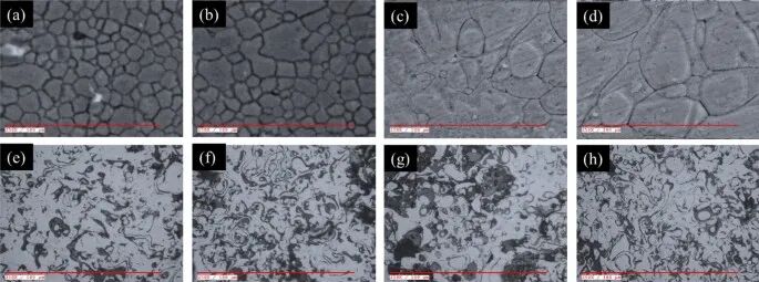 圖3:(a)涂層截面的掃描電鏡圖(b)涂層表面的能譜元素像分析圖(c)涂層的X射線衍射譜圖 圖4展示了未噴涂的基材以及經APS噴涂AlCoCrFeNi HEA涂層的基材在不同溫度退火后的光學顯微照片。其中圖4a-d展示了基材在不同退火溫度下的光學顯微照片。圖4e-h展示了經APS噴涂AlCoCrFeNi HEA涂層的基材在不同溫度退火后的光學顯微照片。其中在圖4a中可以觀察到在400℃條件下退火會產生大量的空隙,從而導致晶粒結構展現出分散的片狀結構。 在圖4b中可以看出進一步將退火溫度提高到550℃后空隙量明顯降低,晶粒結構也因此更加緊密。這表明晶粒結構的位錯減少且樣品內部應力的釋放。從圖4c中可以看出將退火溫度進一步升高超過550℃,晶粒微觀結構沒有變得更加緊密反而變得更加分散,這是由于退火溫度過高導致晶界變化劇烈,重結晶減少導致的。且從圖3d中看到當退火溫度進一步升高至850℃時,基材表面的梯度微觀結構也發生了顯著的變化。 而從圖4e可以看到經過噴涂的樣品在400℃條件下退火,并沒有顯著的晶粒生長和深色相的出現,說明涂層表面存在較多的空隙且有氧化物生成。進一步從圖4f可以看出,將退火溫度進一步提高到550℃會使材料表面的晶界更加細化,晶粒結構出現且變得更加致密且穩定。在圖4g和4h中將退火溫度進一步提升至700℃及850℃,都表現出晶粒尺寸顯著增加,涂層表面的孔隙也進一步地減少的特點。這是因為在高溫退火下內應力的得到釋放,使得暗相擴散導致的。