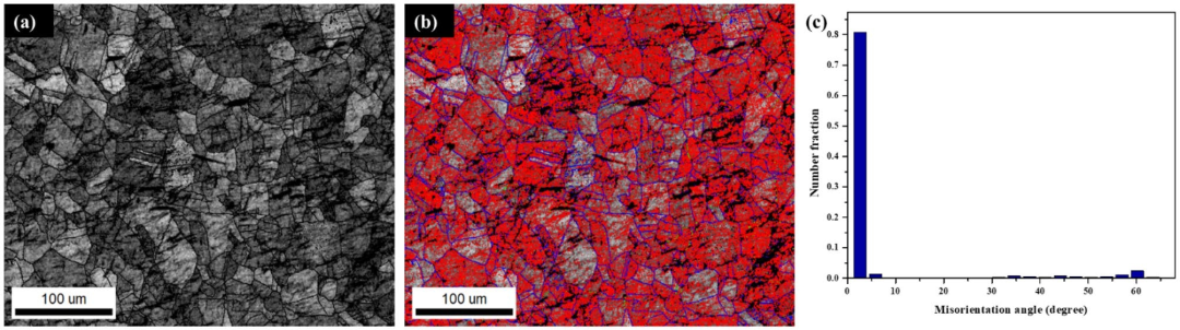 圖7:(a) EBSD 晶粒映射 (b) 晶粒角度邊界 (c) 晶粒角度邊界分布。